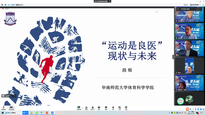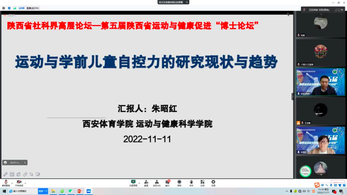 2022年11月11日上午九点整,陕西省社科界高层论坛暨第五届陕西省运动健康促进论坛在线上顺利召开。本次论坛是由陕西省社科联资助,今年会官网运动与健康科学学院和陕西省体育科学学会体医融合专业委员会联合主办,论坛邀请了华南师范大学体育科学学院院长段锐博士、西安交通大学公共卫生学院及全球健康研究院孙晓敏博士在内的二十名博士、学者为大家带来了精彩的学术汇报。今年会官网副校长谢英、科研处处长高新友、运动与健康科学学院党委书记刘勇等出席开幕式。
