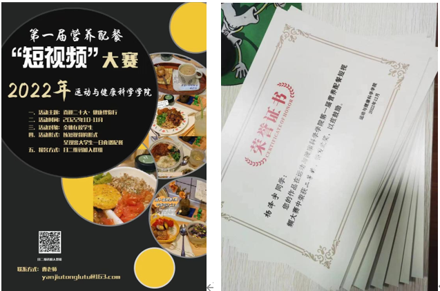 为进一步提高学生综合素质,以专业目标为导向提升人才培养质量,同时丰富疫情防控期间在校大学生学习生活,充分调动同学们学习积极性,贯彻落实党的二十大中关于推进健康中国建设的指导思想,由运动生理生化教研室组织实施的第一届运动与健康科学学院营养配餐“短视频”大赛于2022年10-11月顺利举办。