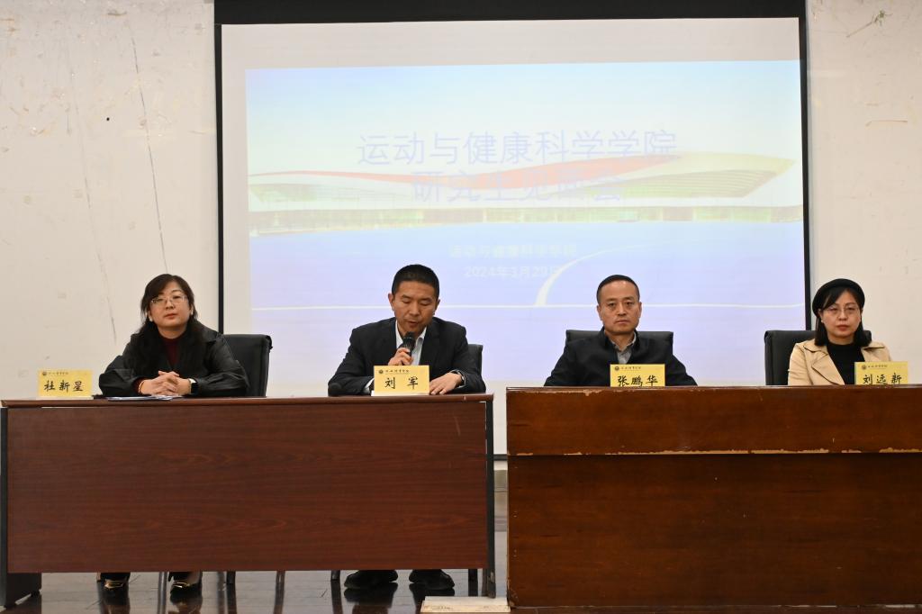 根据今年会“十大改革发展工程”学科建设工程中研究生教育校院两级管理工作实施精神,2024年3月29日中午,运动与健康科学学院在教学楼五楼报告厅召开学院研究生见面会。学院班子成员、学院全体研究生导师、各教研室主任、支部书记、科以上干部、近三年新进博士、学院全体研究生参加了会议。会议由运动与健康科学学院副院长杜新星主持。