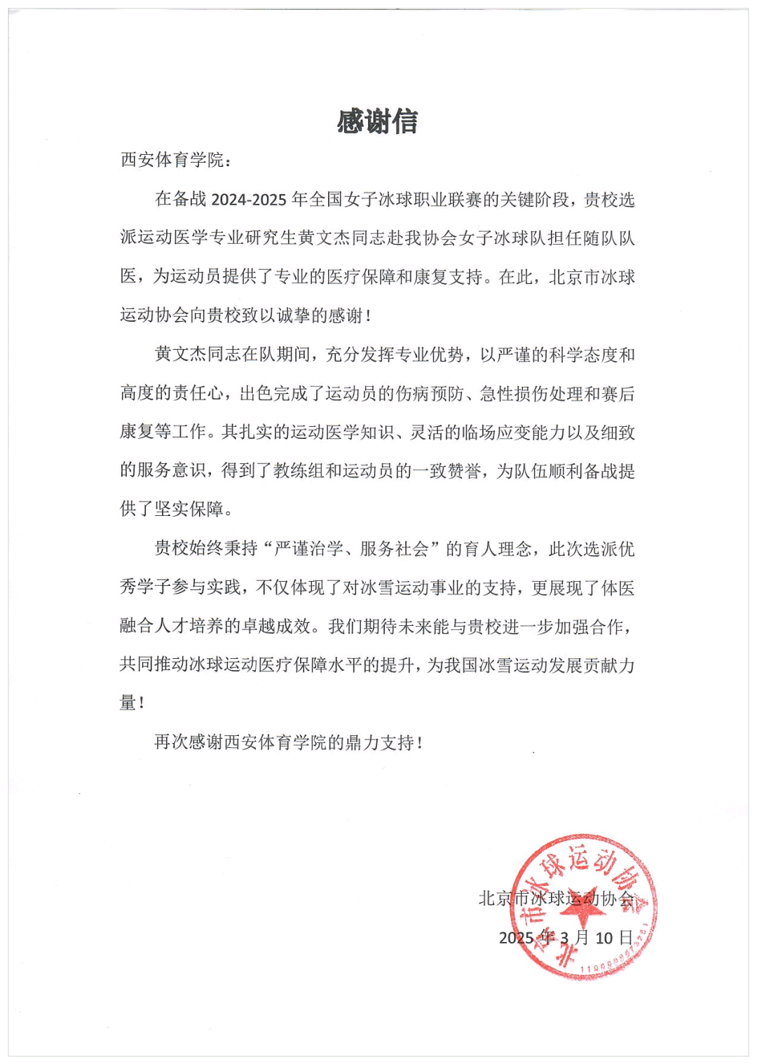 近日,北京市冰球运动协会向今年会发来感谢信,对我院2023级运动医学专业硕士研究生黄文杰同学在2024-2025全国女子职业冰球联赛备战期间担任队医工作的出色表现给予了高度评价和诚挚感谢。