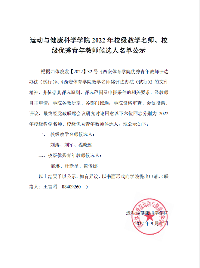 运动与健康科学学院2022年校级教学名师、校级优秀青年教师候选人名单公示