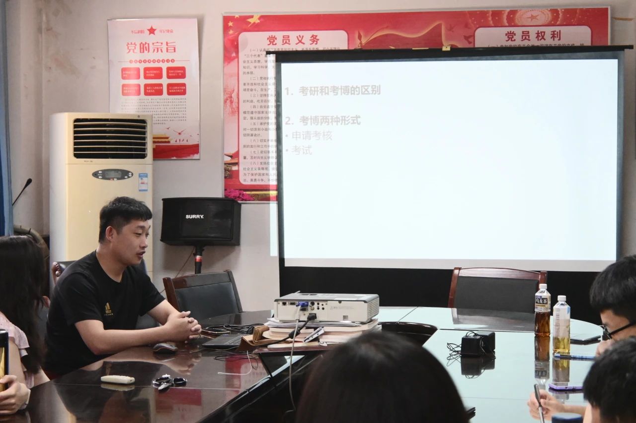 为强化学风建设,搭建高质量交流平台,发挥榜样引领作用,激励广大研究生求学上进,运动与健康科学学院于7月2日下午14:30在实验楼五楼会议室举行研究生考博经验交流分享会。本次交流分享会邀请了两位成功考取博士的2021级研究生,分别是考取上海体育大学的张猛和陕西师范大学的龙滢同学分享各自的考博心路历程。会议由运动与健康科学学院副院长杜新星主持,30余位有意考博的研究生参加会议。