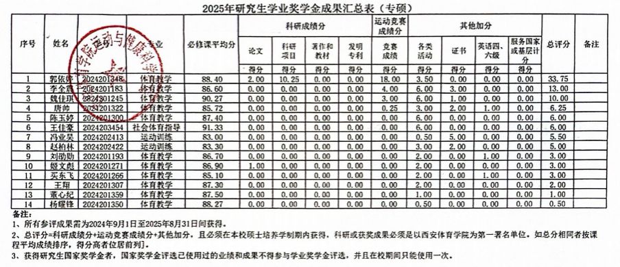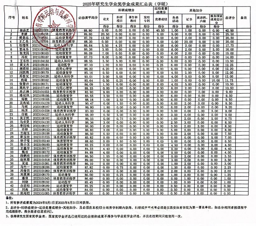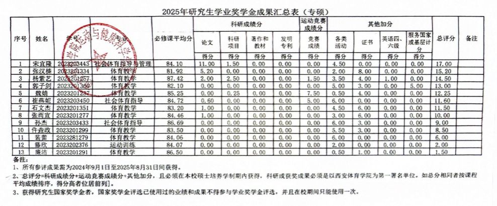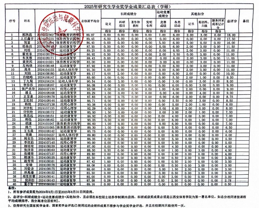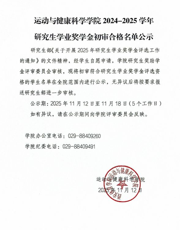 运动与健康科学学院2024-2025学年研究生学业奖学金初审合格名单公示