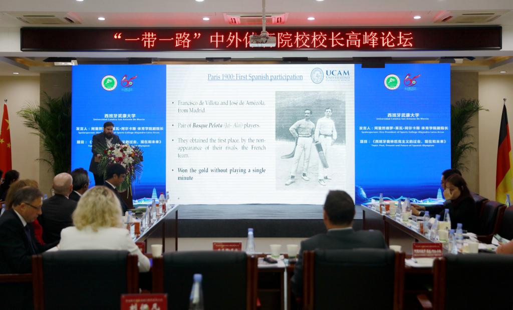西班牙武康大学体育学院副院长阿里然德罗·莱瓦·阿尔卡斯在“一带一路中外体育院校校长高峰论坛”发表演讲