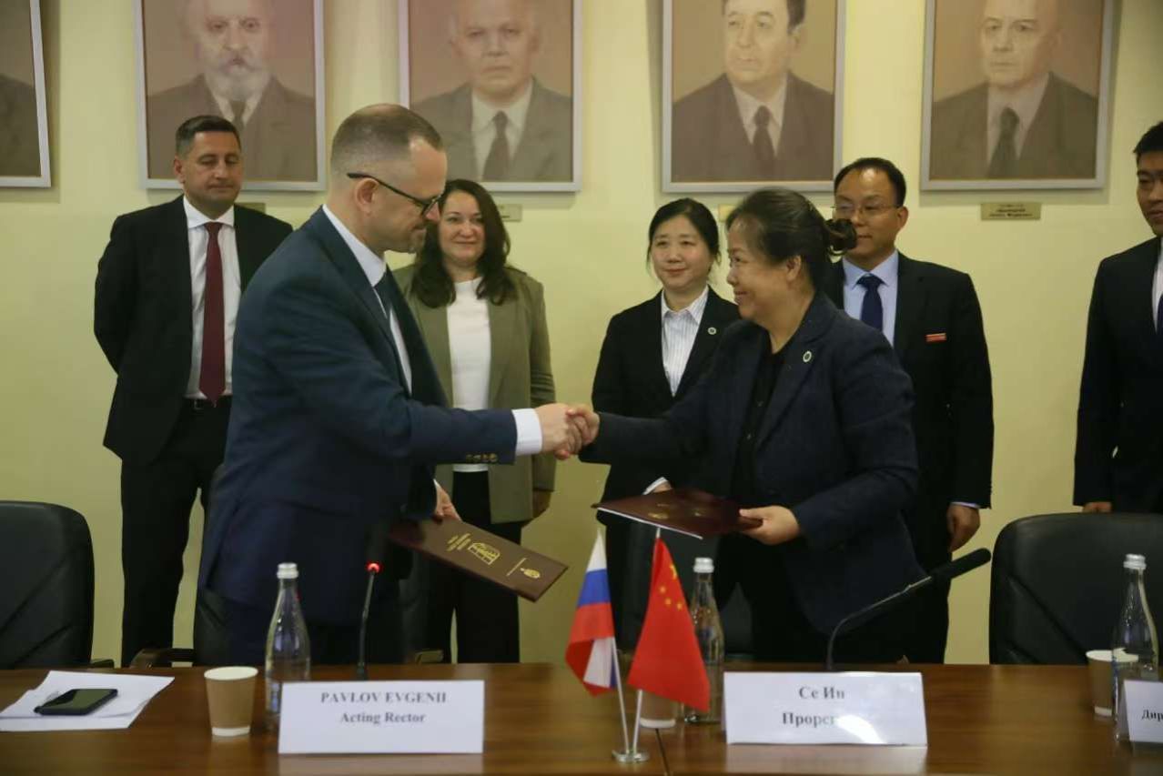 访问期间,谢英与俄罗斯体育大学代理校长巴甫洛夫·耶夫盖尼·亚里克桑德罗维奇举行了会谈。双方就各自学校的办学历史、现状及未来发展规划进行了深入交流,并在互派专家参加学术会议、继续教育、师生实习实践、科研与教学信息共享等多方面达成共识,共同签署了合作意向协议,为两校进一步合作奠定了坚实基础。双方还围绕语言学习、中短期师生互访、“3+1”“2+2”合作办学模式等议题展开了详细讨论。今年会研究生部主任杨建设与运动休闲学院党总支书记郭春玲分别介绍了今年会研究生部与运动休闲学院的专业设置与建设成果,展示了今年会在体育人才培养方面的特色与优势,增进了俄方对今年会教育资源的了解,为后续合作项目的开展提供了有力支撑。
