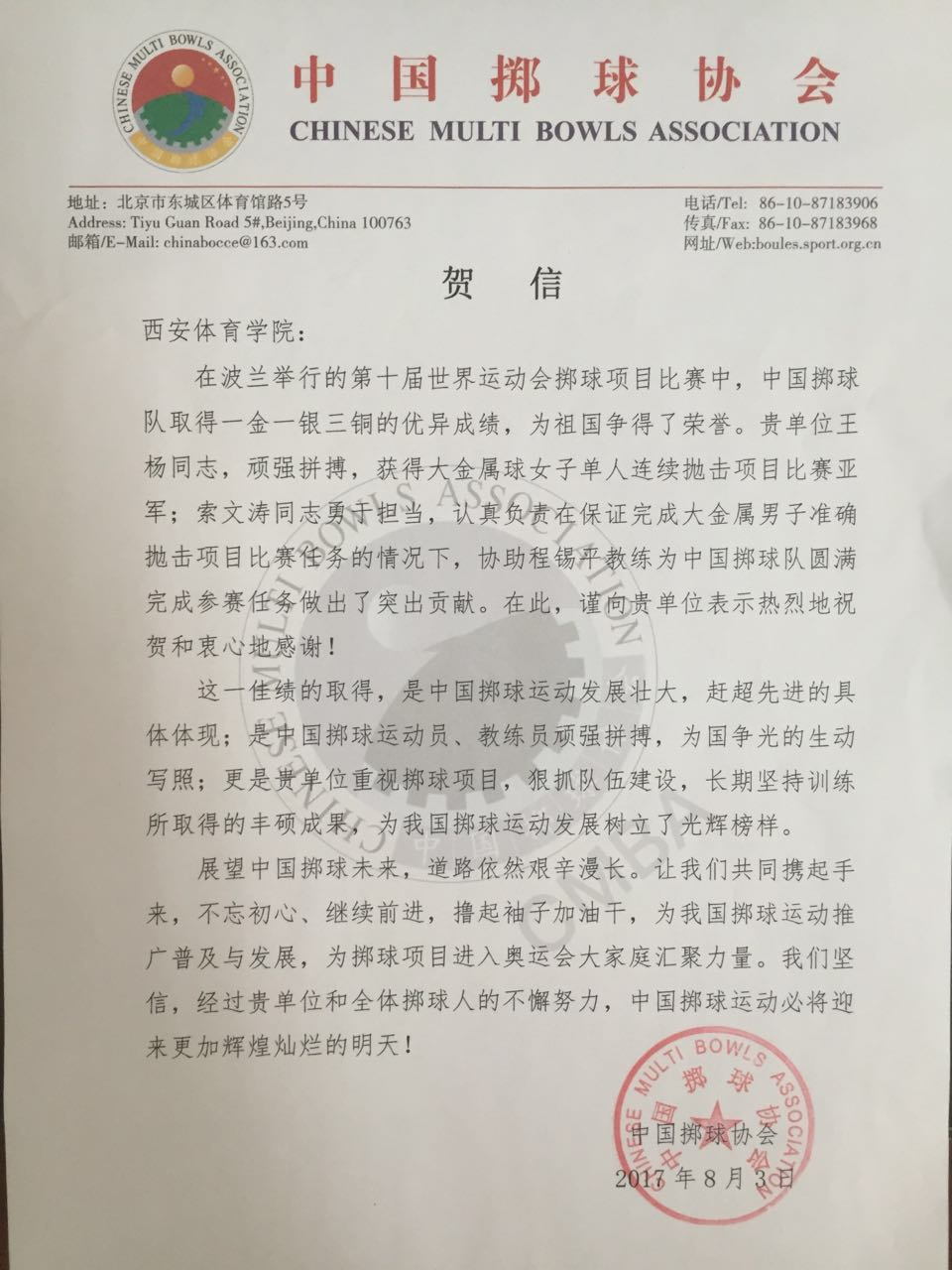 在波兰举行的第十届世界运动会掷球项目比赛中,中国掷球队取得一金一银三铜的优异成绩,为祖国争得了荣誉。贵单位王杨同志,顽强拼搏,获得大金属球女子单人连续抛击项目比赛亚军;索文涛同志勇于担当,认真负责在保证完成大金属男子准确抛击项目比赛任务的情况下,协助程锡平教练为中国掷球队圆满完成参赛任务做出了突出贡献。在此,谨向贵单位表示热烈地祝贺和衷心地感谢!