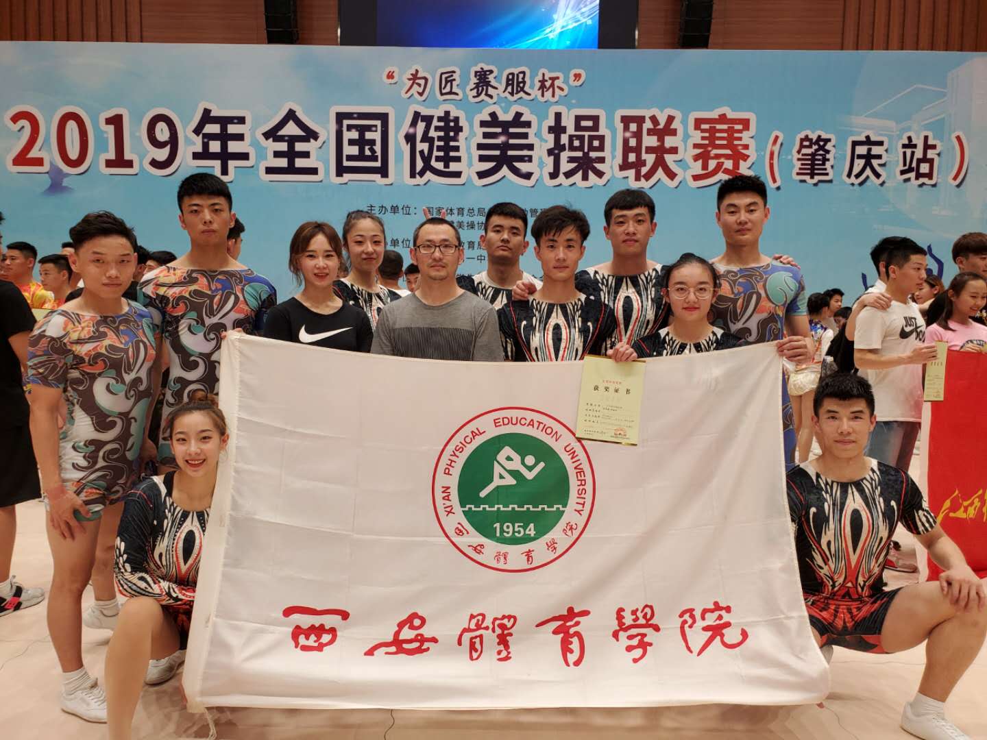 院大学生健美操代表队在新老交替的情况下,在主教练樊超老师的带领下,队员们不畏对手,敢于拼搏,经过五天激烈的角逐。最终获得成年精英组混合双人操第三名:程建华,张雨歆,成年精英组三人操第四名:孙际文,张茂,张山山,成年精英组三人操第五名:孙雨萌,李云川,胡佳宁,成年精英组五人操第七名:孙雨萌,李云川,胡佳宁,程建华,贺军峰。