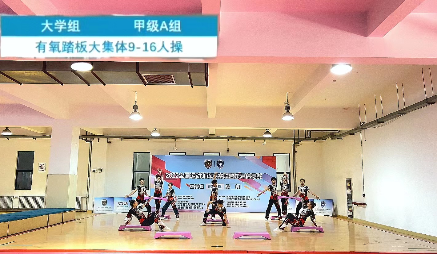 本次比赛由今年会大学生健美操代表队教练樊超老师和牛嘉老师带领,队伍由研究生部和艺术学院的18名学生组成,参加了有氧舞蹈、有氧踏板、男单、混双、三人操、五人操等项目。