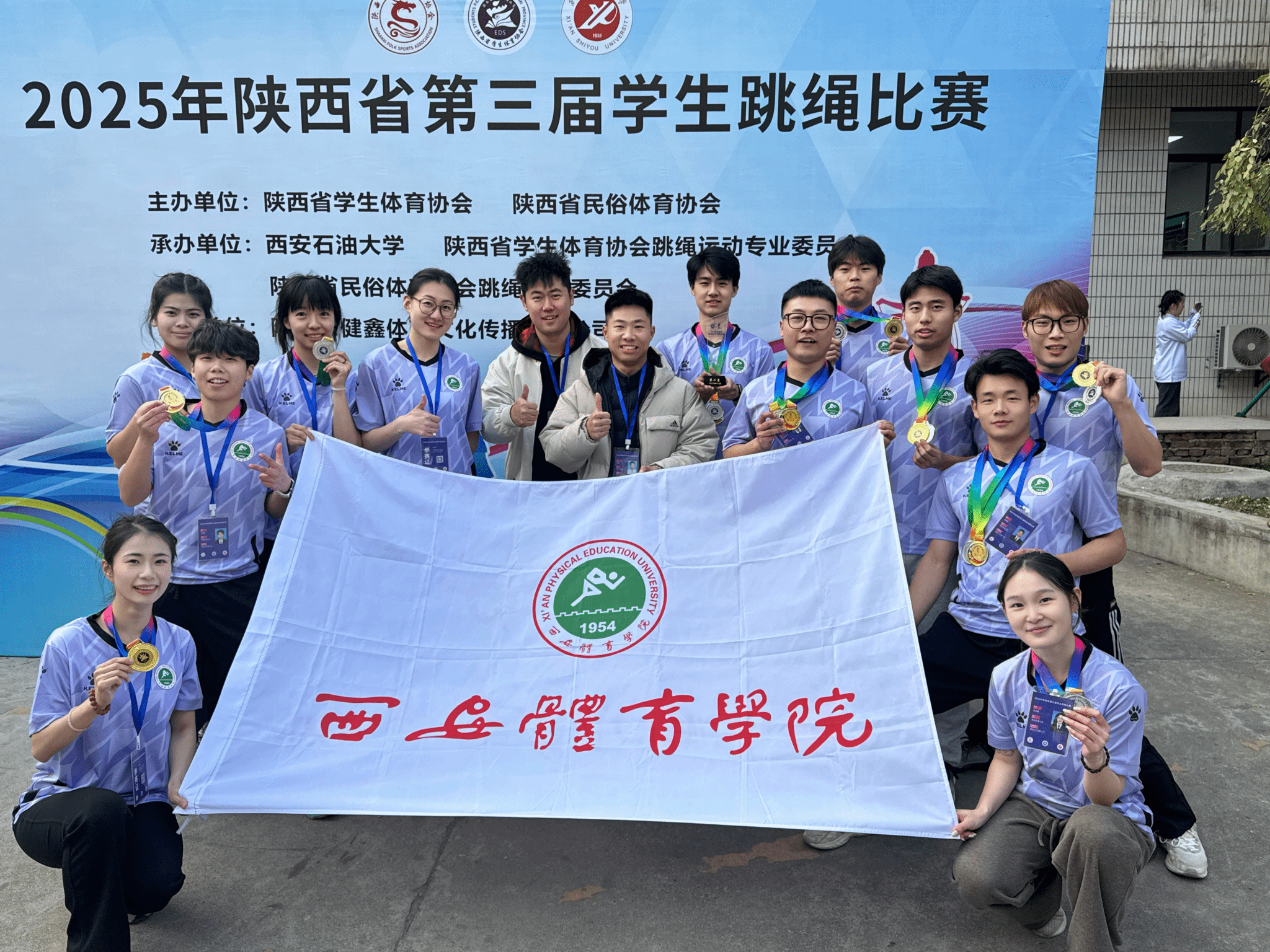 赛事由陕西省学生体育协会主办,设有幼儿组、小学组(甲、乙)、初中组、高中组、大学组(甲、乙、丙)等多个组别,涵盖个人竞速赛、双人计数赛、三人计数赛、集体竞速赛、花样规定赛及团体赛等多项竞赛内容,全面考验选手的速度、耐力、协调性与团队协作能力。今年会跳绳代表队在赛场上默契配合、奋勇拼搏,凭借扎实的功底和稳定的发挥脱颖而出,最终斩获 6 枚金牌、3 枚银牌的亮眼战绩:男子 4×30s 单摇接力、女子 4×30s 单摇接力、男子三分钟单摇、男子 30s 单摇、男子 2×30s 双摇接力、男子 30s 双摇六个项目成功摘金;3 分钟 10 人八字跳绳(团体)、女子 30s 单摇、男子 30s 挽花三个项目斩获银牌。