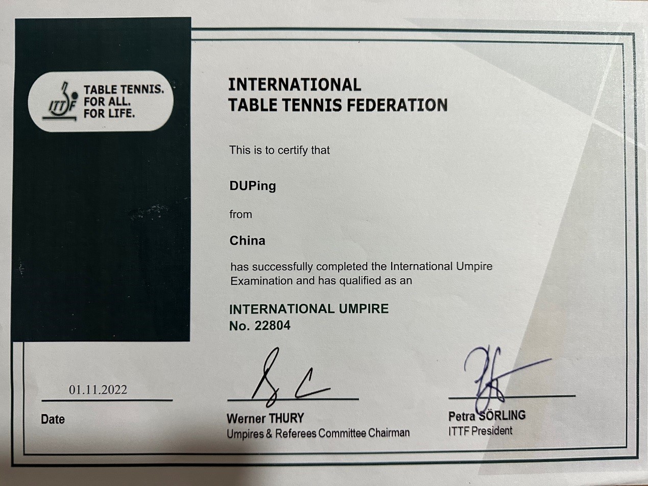 2022年11月1日,我院教师杜平同志晋升为乒乓球国际级裁判员。