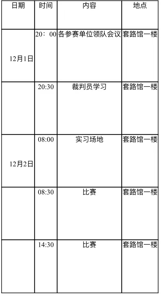 时间:2023年12月1日晚上20:00 武术套路馆一楼