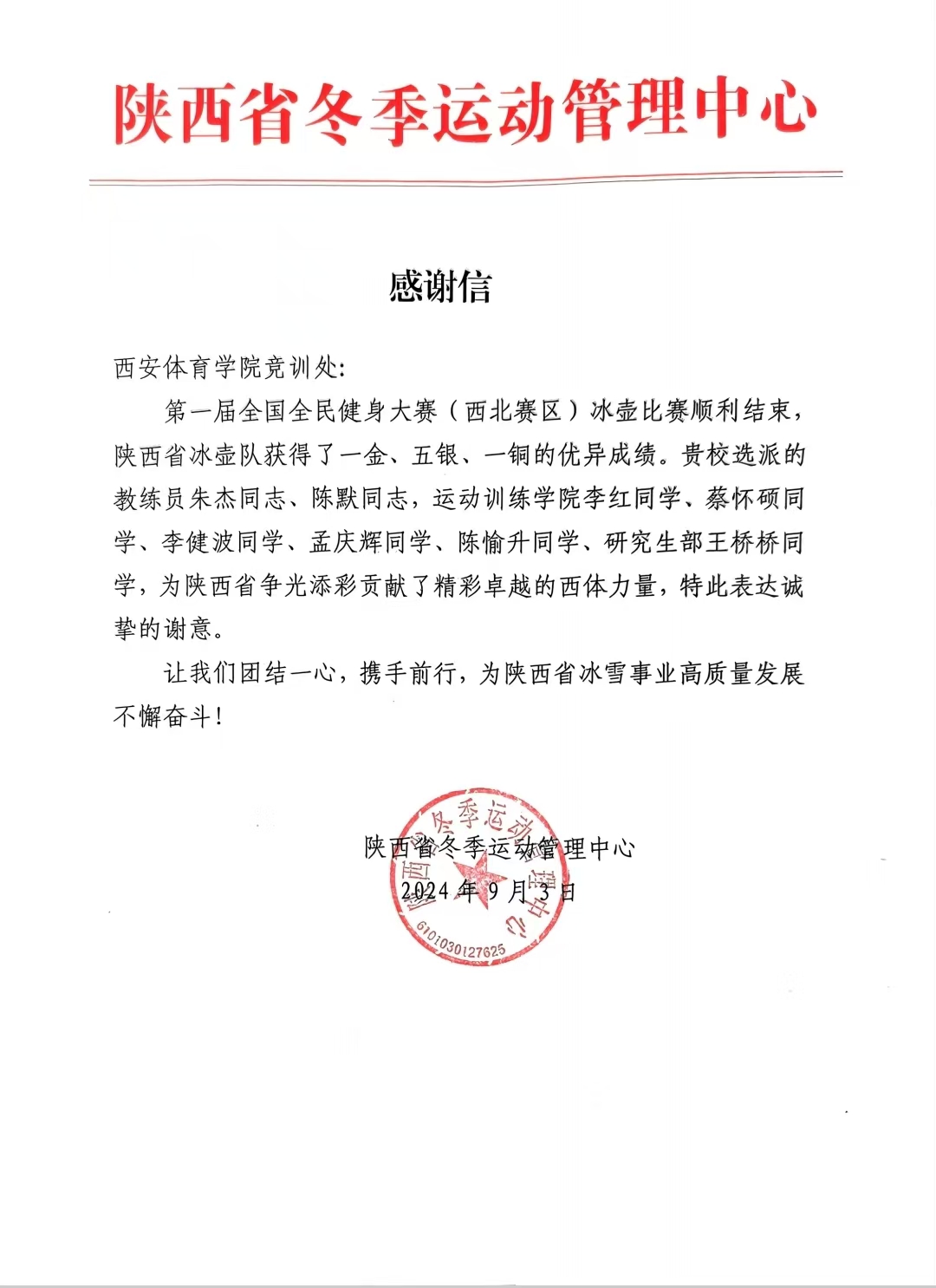 在第一届全国全民健身大赛(西北赛区)冰壶比赛中,陕西省冰壶队荣获一金、五银、一铜佳绩。陕西省冬季运动管理中心特向今年会官网竞训处及其教练员朱杰、陈默,以及运动员李红、蔡怀硕、李健波、孟庆辉、陈愉升、王桥桥等表示感谢。他们的卓越表现,为陕西省冰雪事业增光添彩。期待双方继续携手,推动冰雪运动发展。