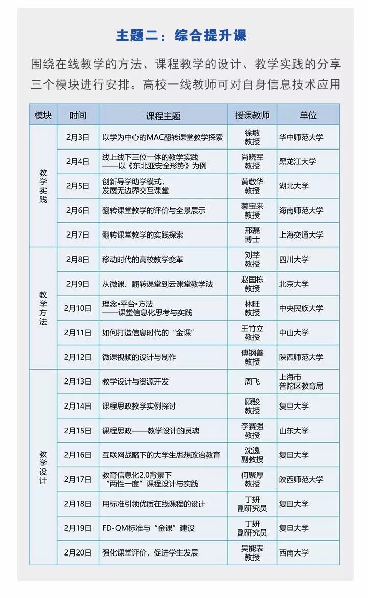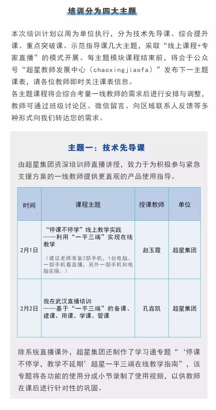 21日起,通过超星“学习通”APP为广大教师提供线上课程或专家直播课程(直接手机获取验证码登录即可),所有课程均为公益性优质网络学习资源。课程将围绕提升信息技术应用能力展开,分为技术先导课、综合提升课、重点突破课、示范指导课四大主题,采取“线上课程+专家直播”的模式开展。每个主题模块课程结束前,将在“超星教师发展中心(chaoxingjiaofa”公众号发布下一主题课表,请各位教师及时关注课表信息。