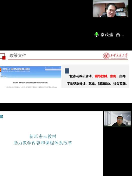 西安交通大学副总编辑秦茂盛做《新时代新时代高校一流教材建设探索》主题讲座,秦茂盛从国家有关政策文件、如何将课程思政元素融入教材、教材编写的要求规范、出版流程以及一流教材的标准,这几个方面,为大家进行了详细和深入的梳理和解读,使广大教师受益匪浅,各位老师对新时代教材建设的理念、目标、办法也都有了更深层次的理解。
