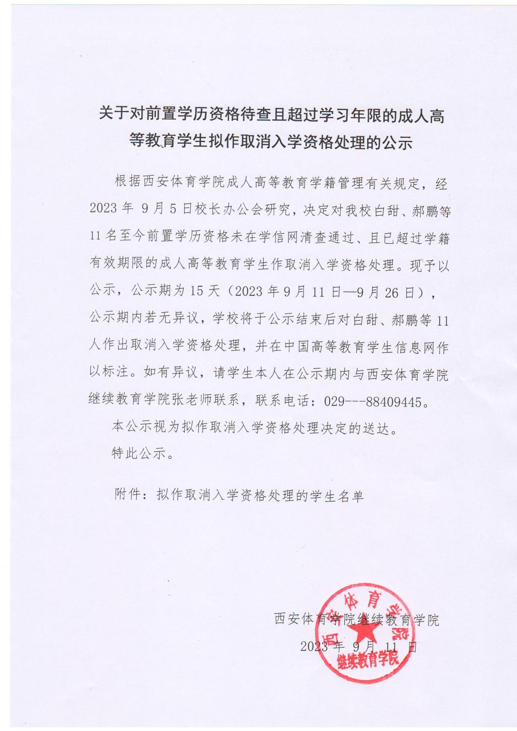 关于对前置学历资格待查且超过学习年限的成人高等教育学生拟作取消入学资格处理的公示