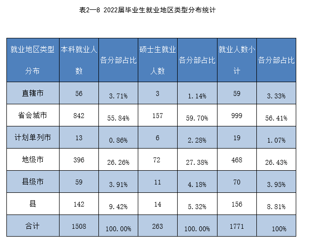 在已就业的1771名本科、硕士毕业生(不含升学、出境、自主创业、国家基层项目) 中,按照就业地区类型分布具体分析如下表。