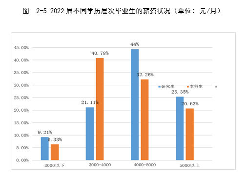 对今年会2022届毕业生的薪资水平进行了电话访谈,随后对数据进行统计,本科毕业生在3000-4000元占比最多,毕业研究生的薪资在4000-5000的占比最多,毕业研究生的薪资在4000以上的要多于本科毕业生,详情如下图所示: