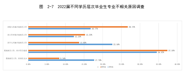 在调查的2022届的毕业生中,65.72%毕业生毕业以后的工作与他们在学校所学专业相关,其中本科毕业生的专业相关度为68.44%,毕业研究生的相关度为62.68%。对不相关的原因进行询问,最后进行统计,结果如下: