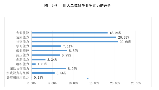 用人单位对本校毕业生在工作中的能力评价如下图所示:其中用人单位认为本校毕业生的“适应能力”(20.33%)、“社交能力”(20.68%)和“专业技能”(18.24%)这三项素质比较强;而“计算机应用能力”和“组织能力”则相对较为薄弱,需进一步加强。