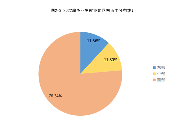 在已就业的1771名本科、硕士毕业生(不含升学、出境、自主创业、国家基层项目) 中,有1352人在西部就业,占就业总数的76.34%;有210人在东部就业,占就业总数的11.86%,209人在中部就业,占就业总数的11.80%。
