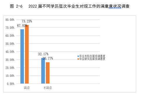 在薪资满意度方面:2022届本科毕业生对薪资满意的占67.83%,毕业研究生对薪资满意的占73.23%。