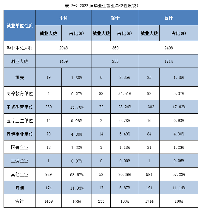 2022届已签约的1714名本科、硕士毕业生按照就业单位性质具体分析如下图。