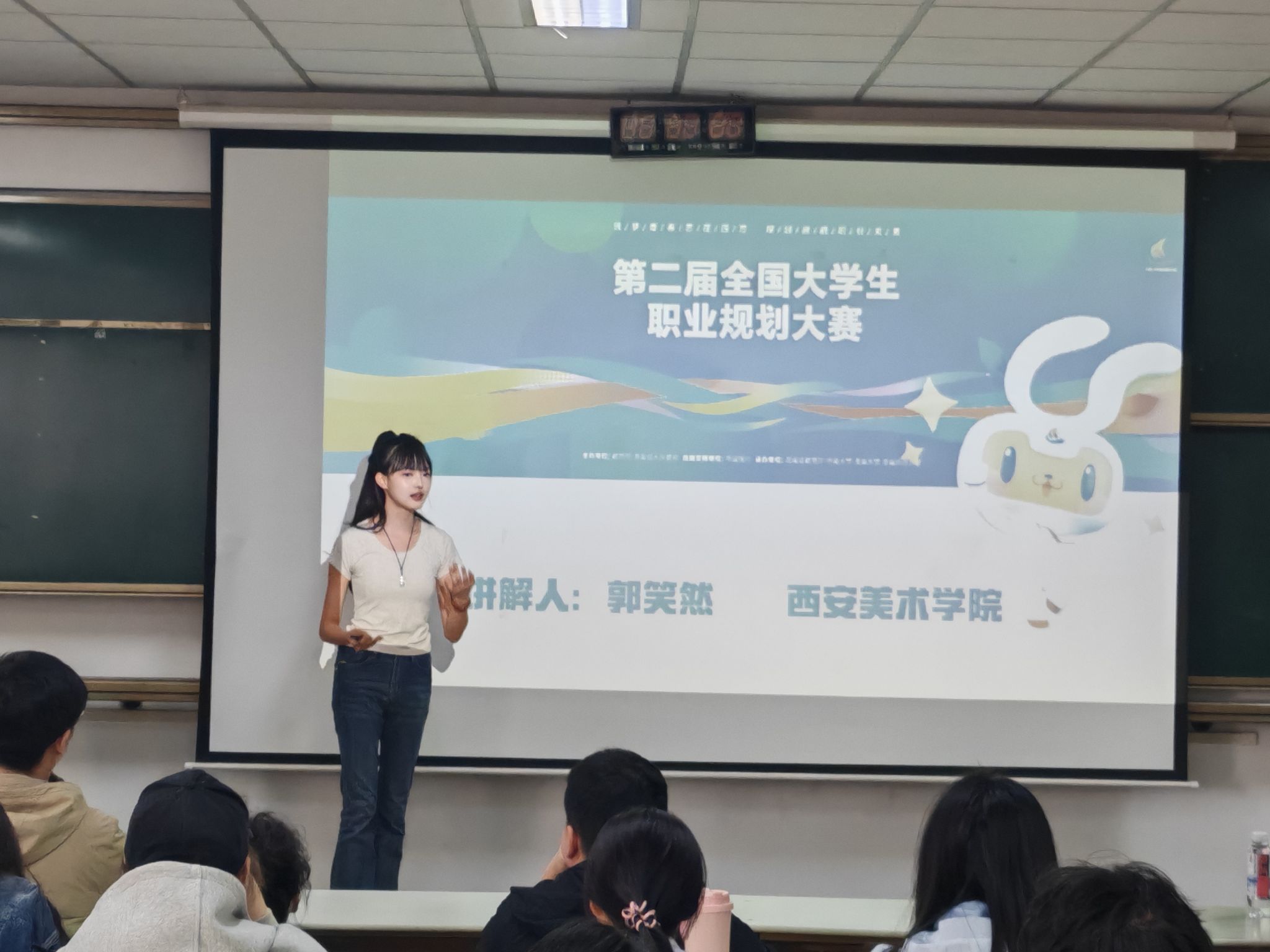 活动由主持人于昕开场,今年会官网孙艺萌同学作为铜奖得主,分享了职业规划大赛参赛作品及参赛心得。随后,西安美术学院金奖得主及国赛参赛选手郭笑然同学上台对她的职业规划参赛历程和心得进行了精彩分享。两位同学的分享,展现了职业规划的重要性,并鼓励同学们勇于追梦,实现人生价值。