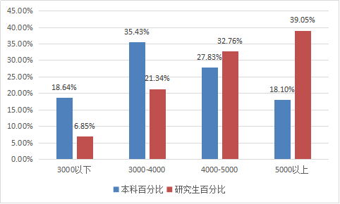 对今年会2019届毕业生的薪资水平进行了电话访谈,随后对数据进行统计,本科毕业生在3000-4000元占比最多,毕业研究生的薪资在5000以上的占比最多,毕业研究生的薪资在4000以上的要多于本科毕业生,详情如下图所示: