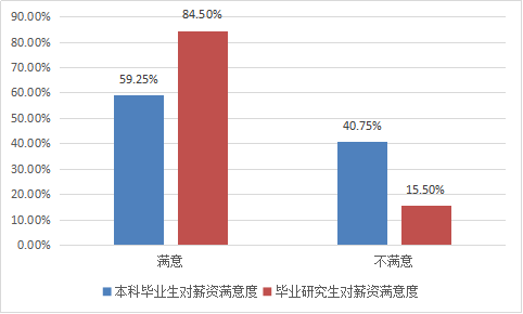 在薪资满意度方面:2019届本科毕业生对薪资满意的占59.25%,毕业研究生对薪资满意的占84.50%。