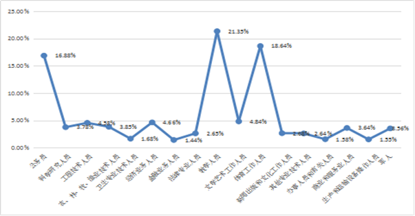 在就业职位意向的选择上,学生意向较高的是“教学人员”(21.35%);“体育工作人员”(18.64%);“公务员”(16.88%)等。