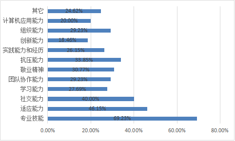 用人单位对本校毕业生在工作中的能力评价如下图所示:其中用人单位认为本校毕业生的“专业技能”(69.23%)、“适应能力”(46.15%)和“社交能力”(40.00%)这三项素质比较强;而“计算机应用能力”和“创新能力”则相对较为薄弱,需进一步加强。