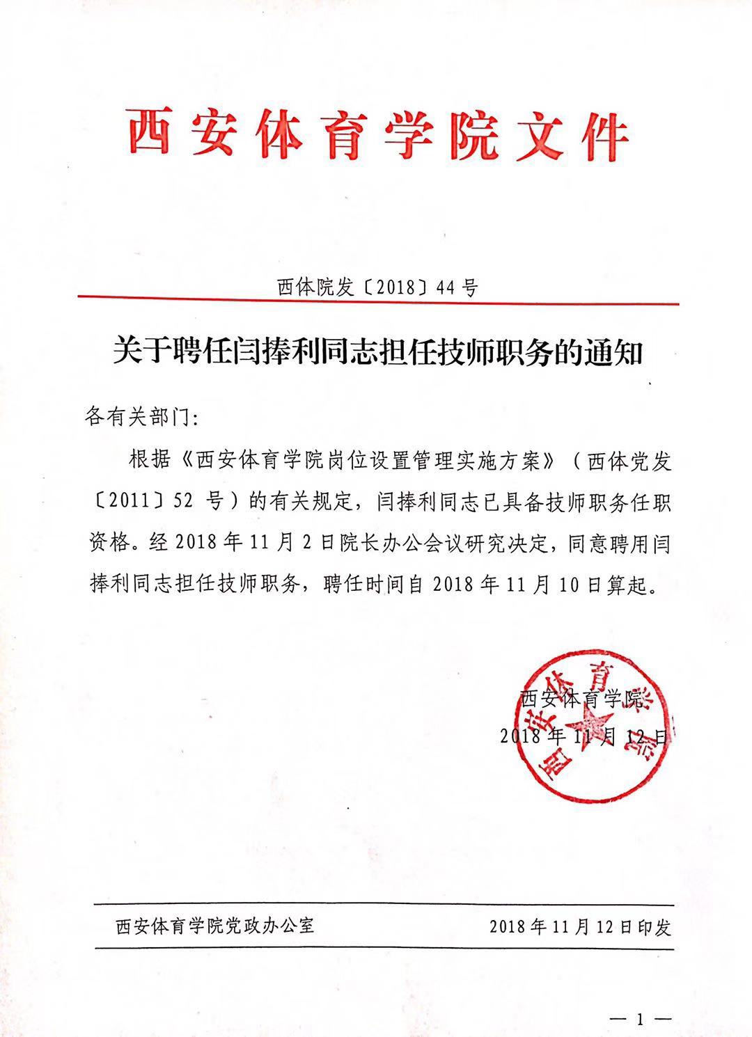 关于聘任闫捧利同志担任技师职务的通知