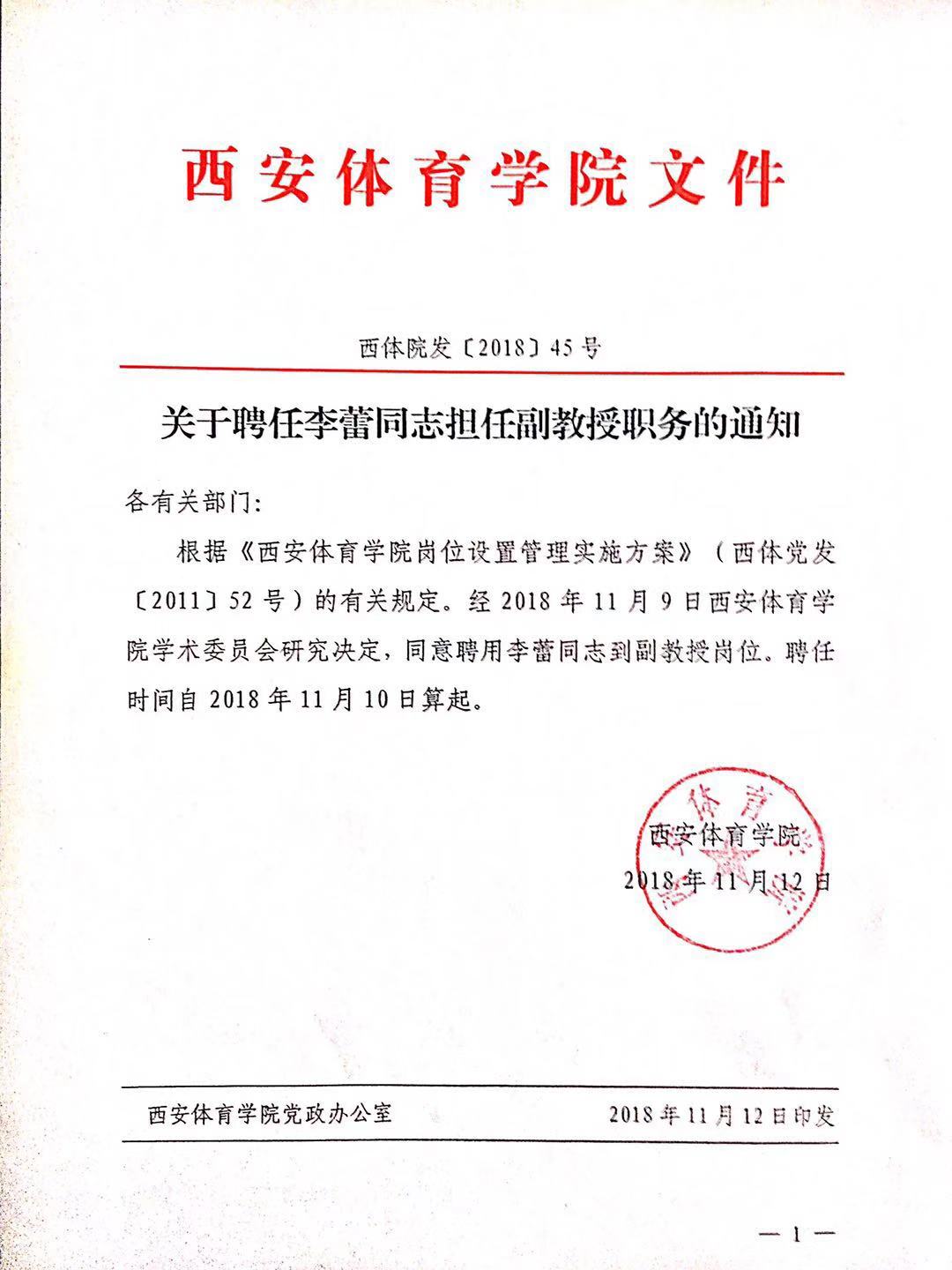 关于聘任李蕾同志担任副教授职务的通知