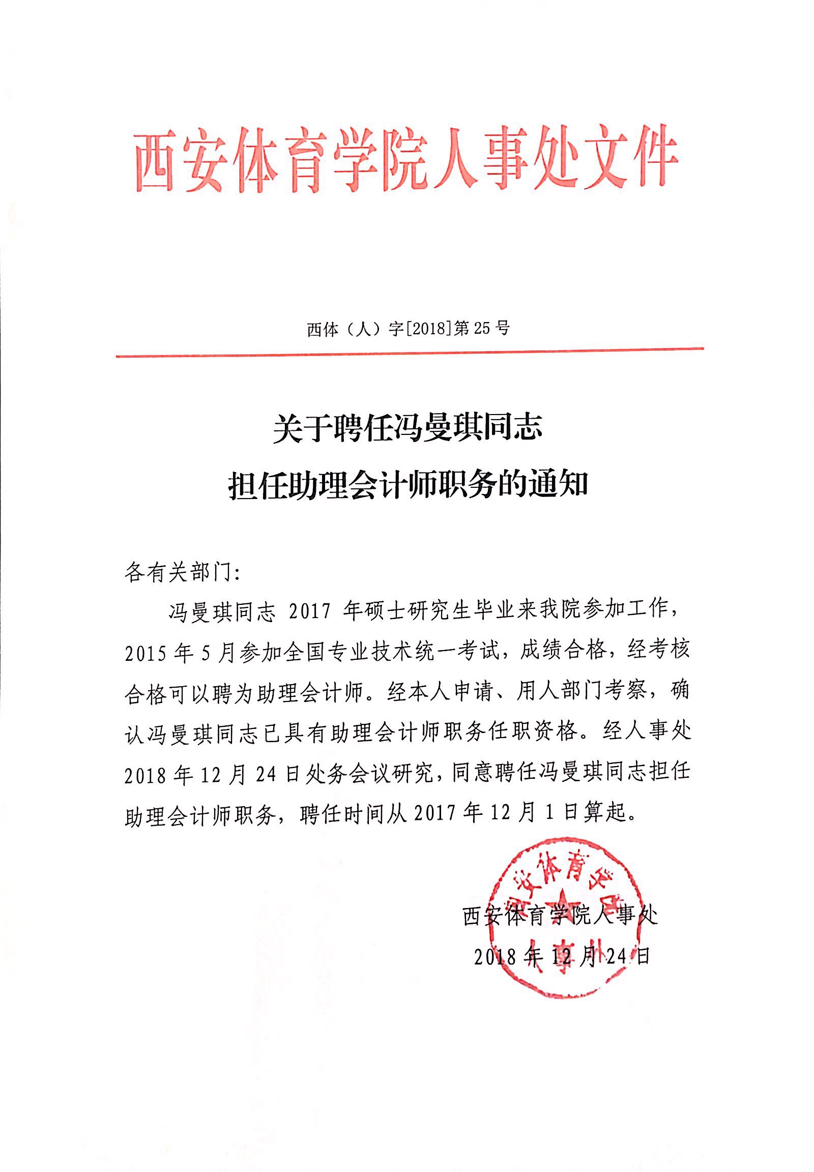 关于聘任冯曼琪同志担任助理会计师职务的通知