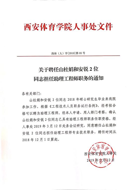 关于聘任山杜娟和安锐2位同志担任助理工程师职务的通知