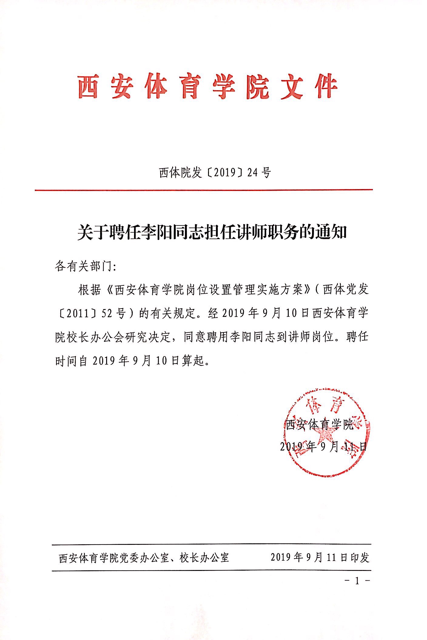 关于聘任李阳同志担任讲师职务的通知
