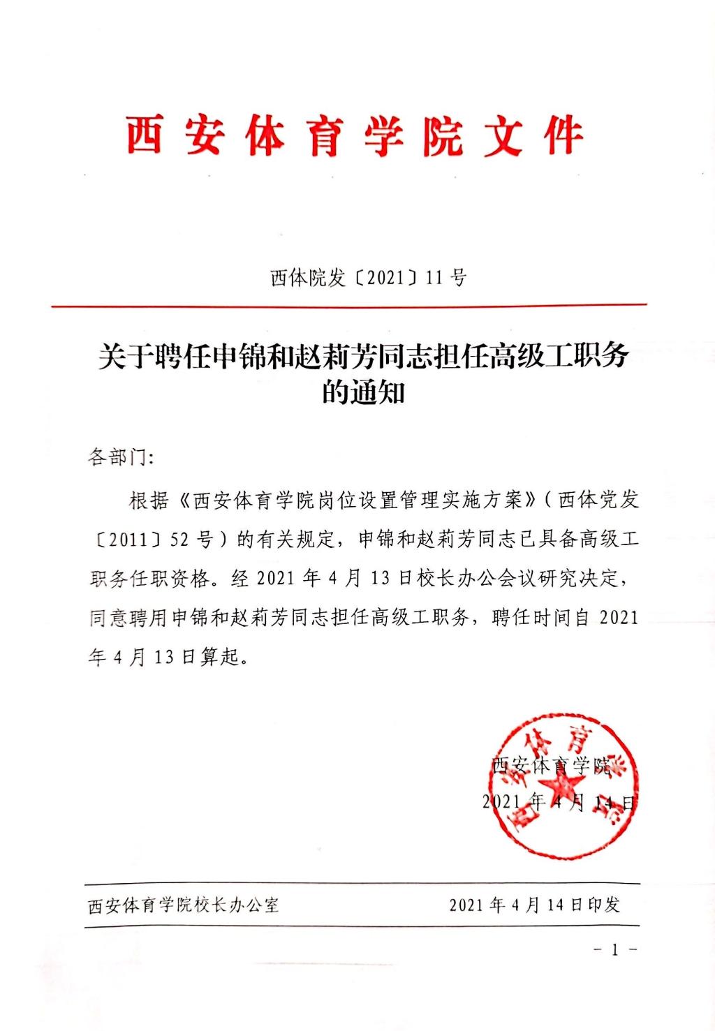 关于聘任申锦和赵莉芳同志担任高级工职务的通知