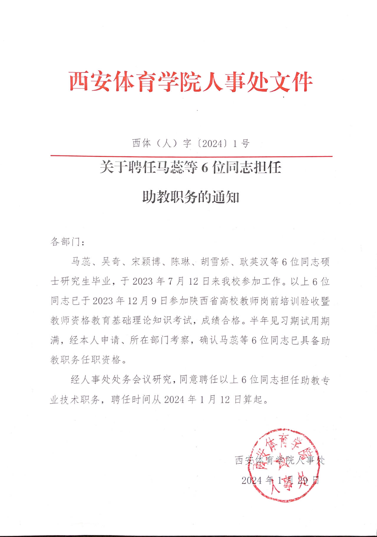关于聘任马蕊等6位同志担任助教职务的通知