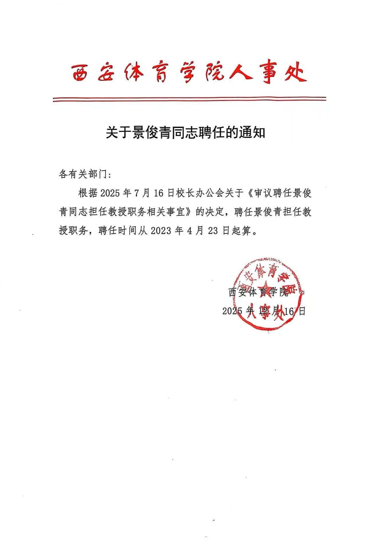 关于景俊青同志聘任的通知