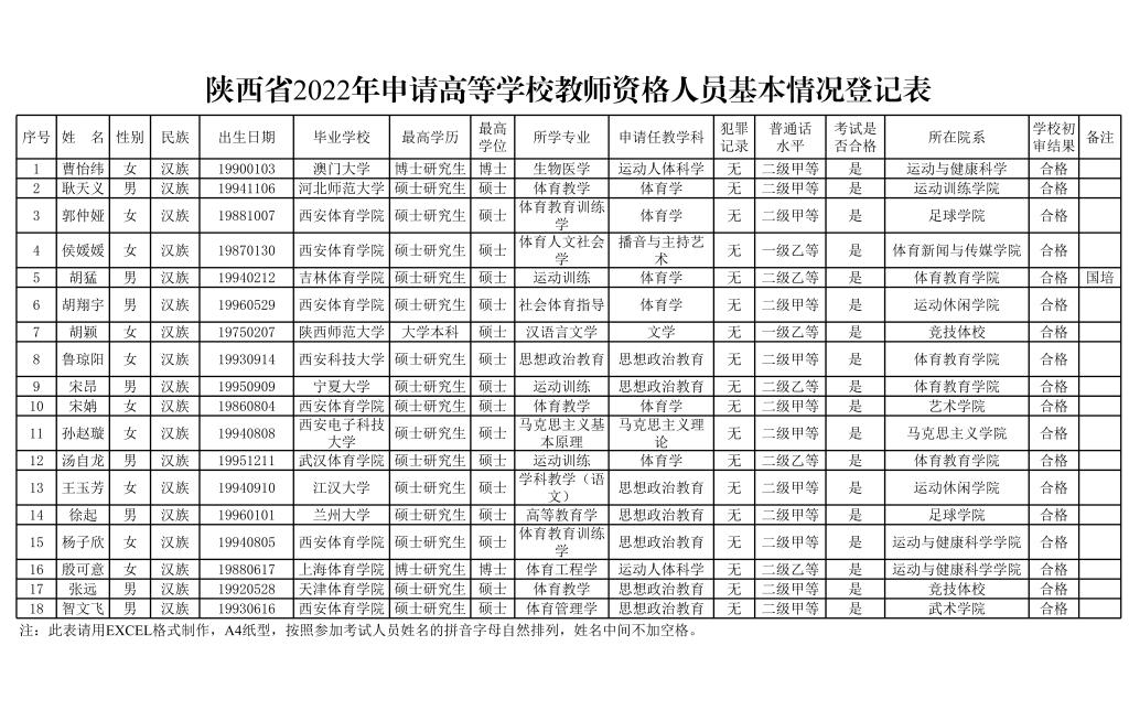 根据陕西省教育厅《关于做好 2022 年全省高等学校教师 专业技能考试与教师资格认定工作的通知》(陕教师办〔2022〕26 号)要求,现将我校参加2021年教师资格教育基础理论知识考试合格,符合陕西省2022年申请高等学校教师资格人员基本情况予以公示,公示期5天,如有异议,请于2022年6月16日前向人事处或校纪检监察部门客观如实地反映公示对象的情况。