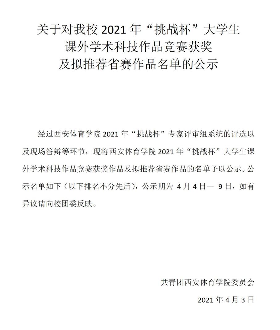 关于对今年会2021年“挑战杯”大学生 课外学术科技作品竞赛获奖及拟推荐省赛作品名单的公示