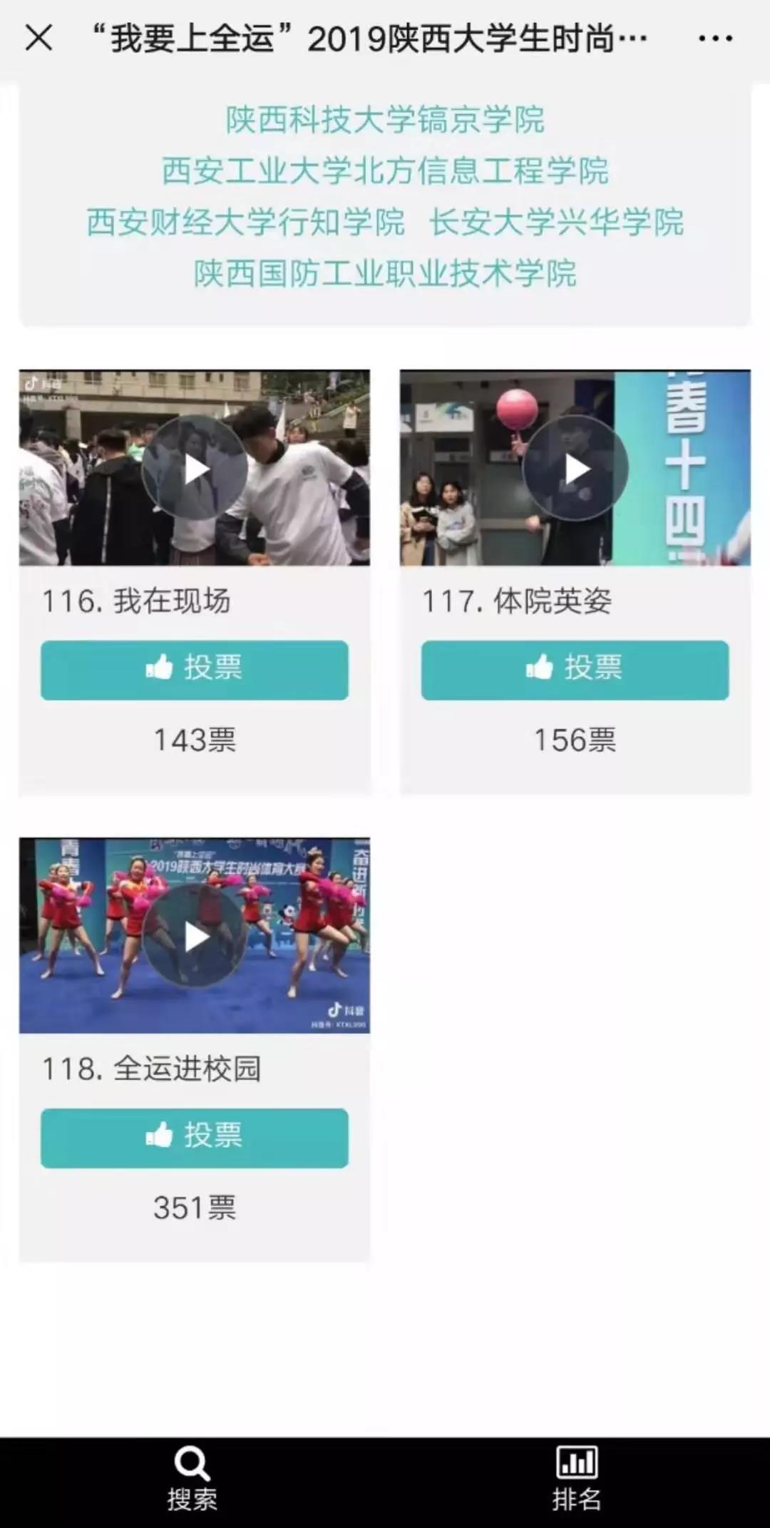 2019年10月至11月,“我要上全运”2019陕西大学生时尚体育大赛在我省举办,大力弘扬体育精神和全运文化,全面展现新时代大学生蓬勃向上的青春活力,搭建大学生参加全国运动会的桥梁,带动更多人加入到体育活动中来,感受运动带来的快乐和健康,让全运会成为三秦百姓的热门话题。