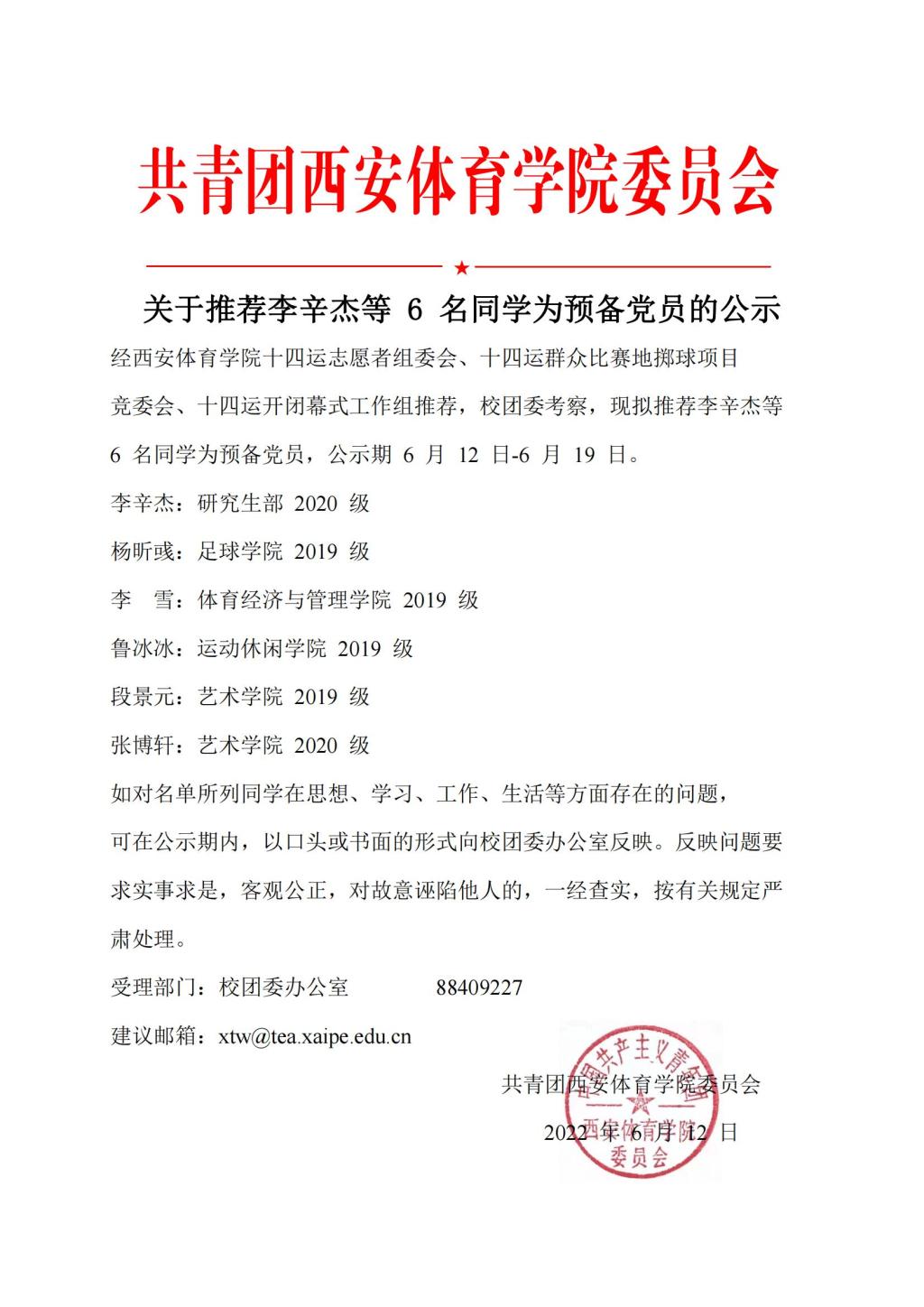 关于推荐李辛杰等 6 名同学为预备党员的公示