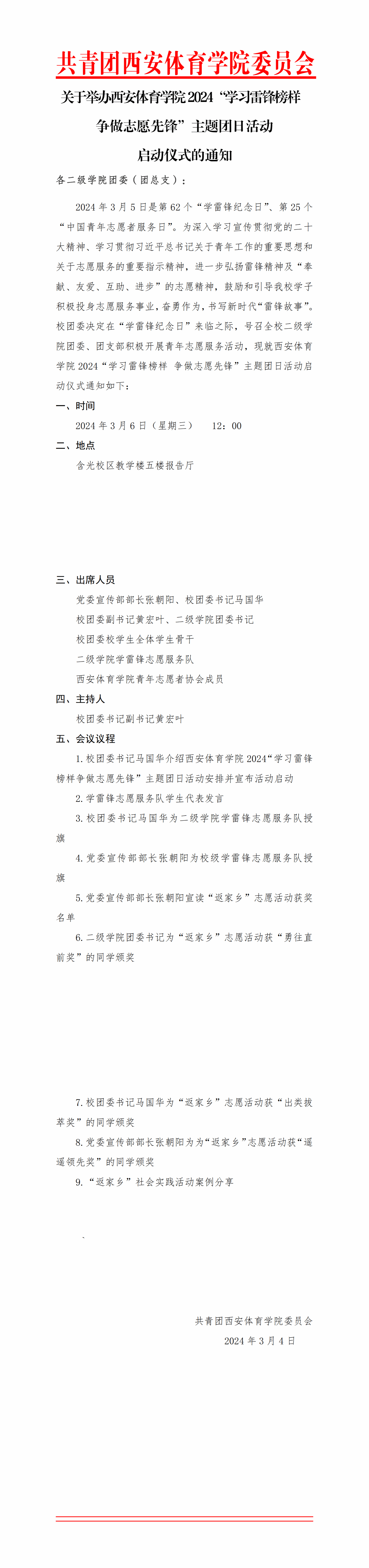 关于举办今年会官网2024“学习雷锋榜样 争做志愿先锋”主题团日活动 启动仪式的通知