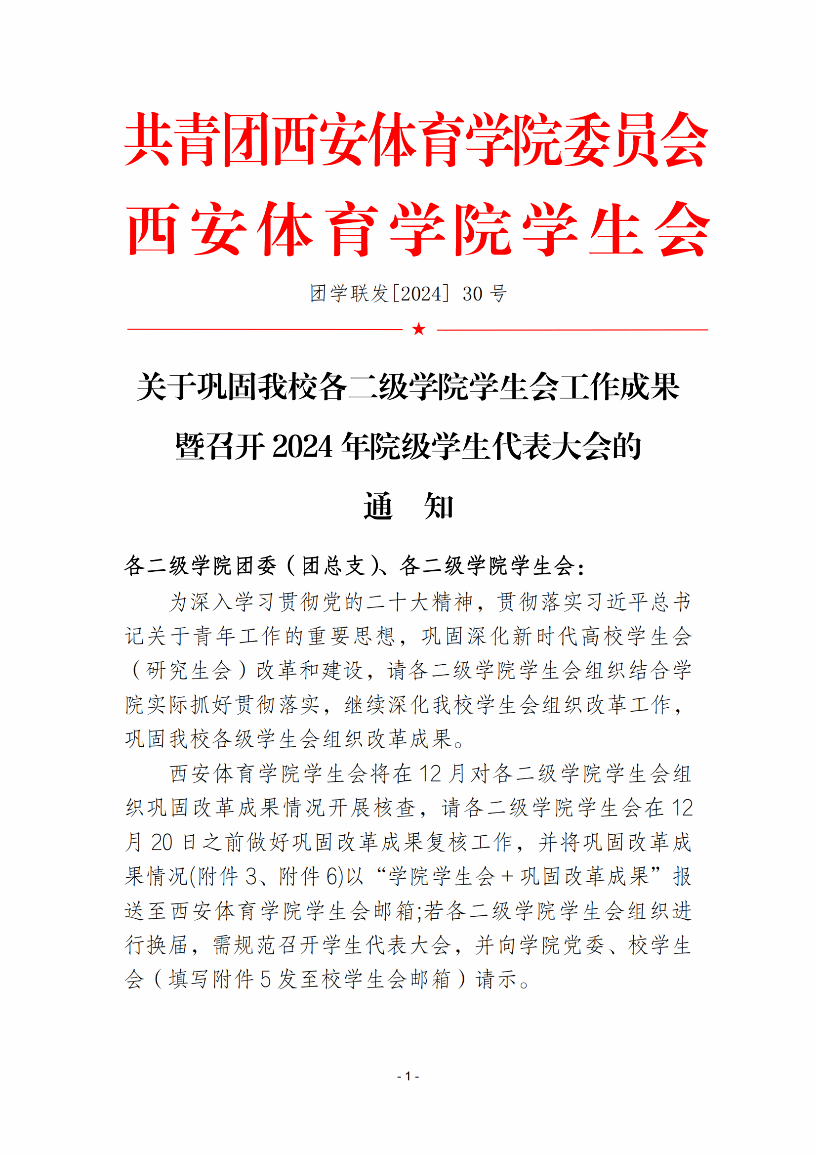 关于巩固今年会各二级学院学生会工作成果 暨召开 2024 年院级学生代表大会的通 知