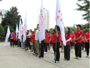 刘子实、高玉峰、张朝阳、党校办主任张军、学工部部长王志刚、教务处处长张葆欣分别为各学院实践服务团授旗。每一面旗帜都是一份责任与担当,他们将带着这份责任与担当,把青春奉献在党和国家最需要的地方。