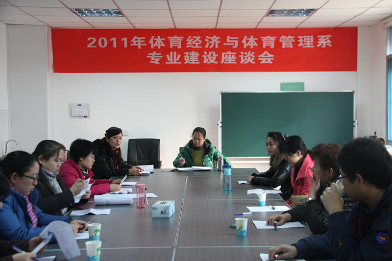 2011年12月22日,体育经济与体育管理系“专业建设研讨会”在系实验室举行。系主任谢英、系副主任党挺、办公室主任、教学秘书以及全体教师参加了会议。会议围绕我系三个专业培养方案执行情况以及完善实践教学环节等问题进行了广泛的研讨。研讨会由系副主任党挺主持。