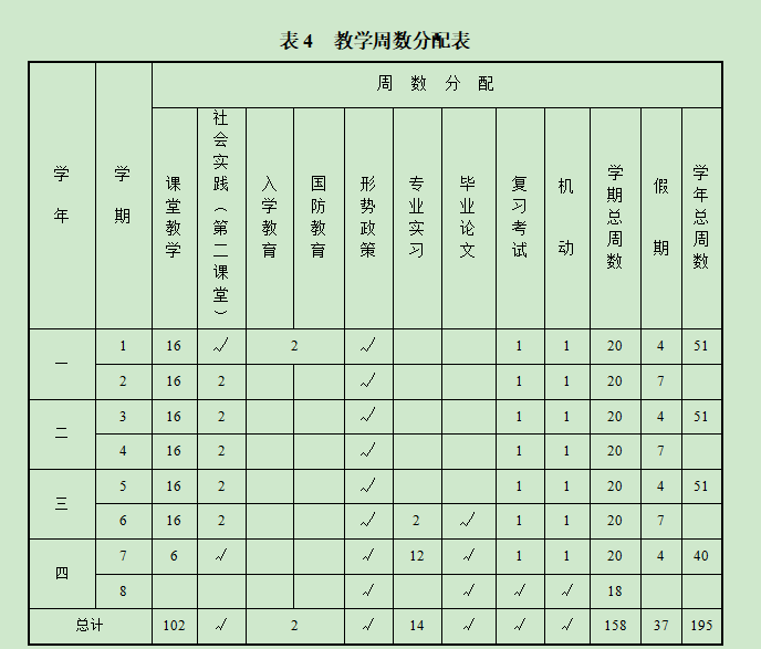 六、课程设置结构与教学周数分布(表3和表4)