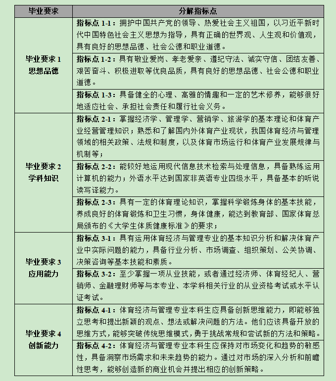 目标2(行业专职能力):具备体育经济和管理的相关知识和技能。毕业生应该深入了解体育经济和管理的相关知识和技能,包括财务管理、市场营销、运营管理、项目管理等,能够在体育组织和企业中从事相关岗位的工作,并能够有效地解决实际问题和提供专业指导。