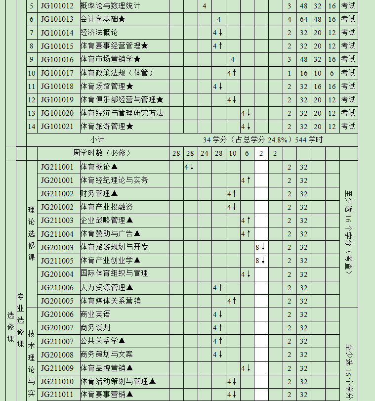 备注:1.“√”表示根据情况确定具体时间。“↑”表示前八周上课,“↓”表示后八周上课。